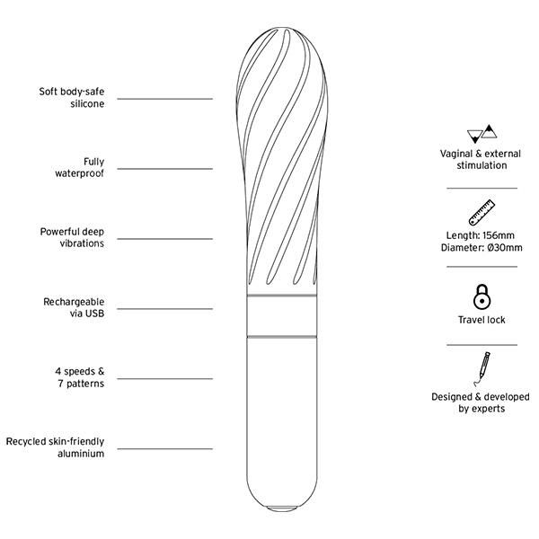 ●素材:シリコン、リサイクルアルミニウム、リサイクルABS樹脂、バイオプラスチック●充電方法:USB●充電時間:フル充電2時間●連続使用可能時間:最大1時間●振動パターン:10(振動強弱4段階+リズムパターン6種)●防水:完全防水(IP67)
