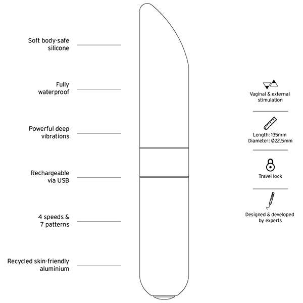 ●素材:シリコン、リサイクルアルミニウム、リサイクルABS樹脂、バイオプラスチック●充電方法:USB●充電時間:フル充電2時間●連続使用可能時間:最大1時間●振動パターン:10(振動強弱4段階+リズムパターン6種)●防水:完全防水(IP67)●トラベルロック機能つき