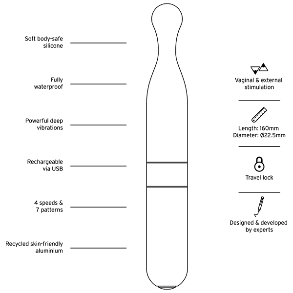 ●素材:シリコン、リサイクルアルミニウム、リサイクルABS樹脂、バイオプラスチック●充電方法:USB●充電時間:フル充電2時間●連続使用可能時間:最大1時間●振動パターン:10(振動強弱4段階+リズムパターン6種)●防水:完全防水(IP67)●トラベルロック機能つき