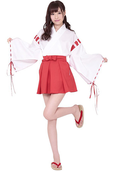 願い事があるなら、まずはお祈りしてね!白着物に赤のパイピングリボンが印象的な、巫女さんのコスチューム。