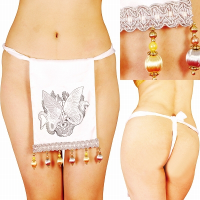 <EROX>裾のフリンジが目を惹くふんどしデザインのお洒落な下着。ホワイトカラーに存在感バツグンの和テイストプリントを施しました。開放感のあるTバックスタイルが妖艶な色気を醸し出す、セクシーなパンドルショーツです。