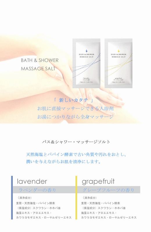 シャワーだけでもOK!直接マッサージできる入浴剤が登場!お肌をなめらかにひきしめる全身美容マッサージソルト(1回分)。