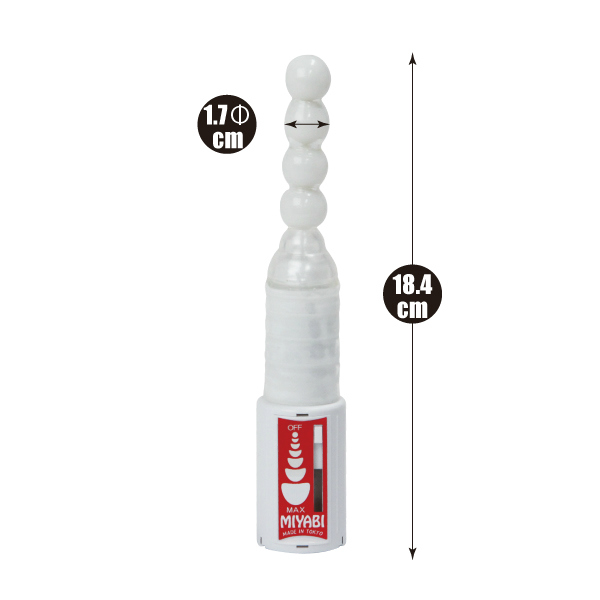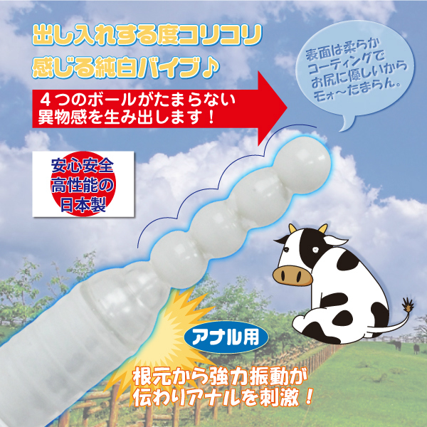 ミルクのように真っ白な玉を4つ連ねた国産アナルバイブは、単4電池×3本が作り出す強力な振動が自慢!自在に曲がる挿入部分の先端まできちんと伝わって、肛門も腸内も刺激します!操作はスライドのみで簡単!バイブレーションを無段階に調節できて便利です。