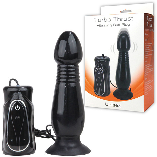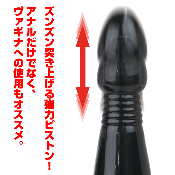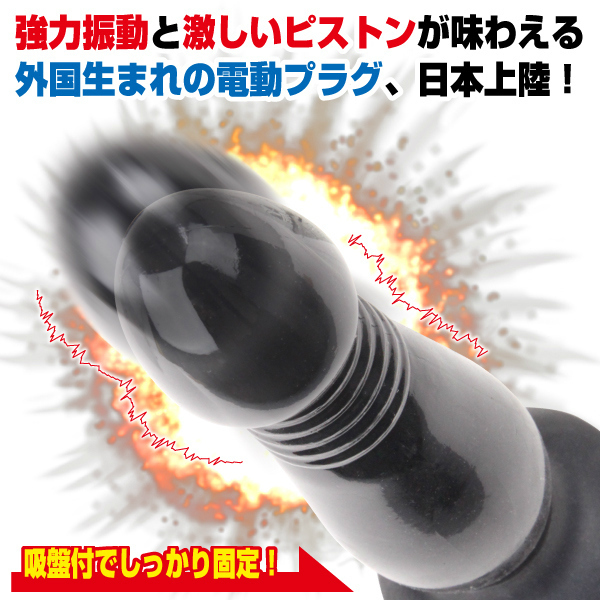 強力吸盤で固定力抜群!ソフトブラック樹脂製、ピストン機能付き電動アナルプラグ。