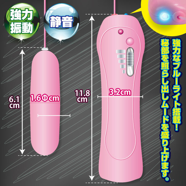 全長約6.1cmのロングローターが、3パターンの強力振動で性感帯をピンポイントに刺激!また、振動操作部の先端にあるブルーLEDが、秘部をイヤらしく照らします。