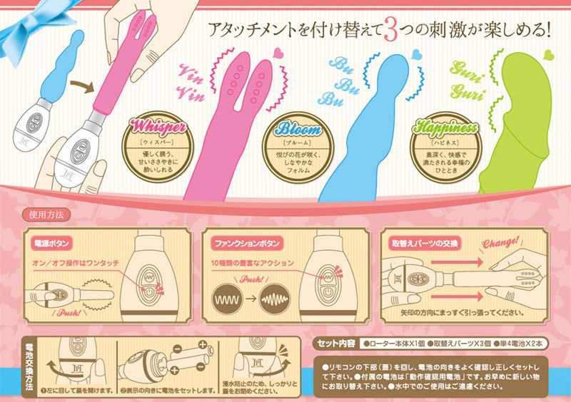 仕様:パッケージ:16.0×19.0×5.5cm 本体:全長12.6cm アタッチメント全長ウィスパー(ピンク)11.4cm・ブルーム(ブルー)9.8cm・ハピネス(グリーン)9.8cm単四電池2本付属