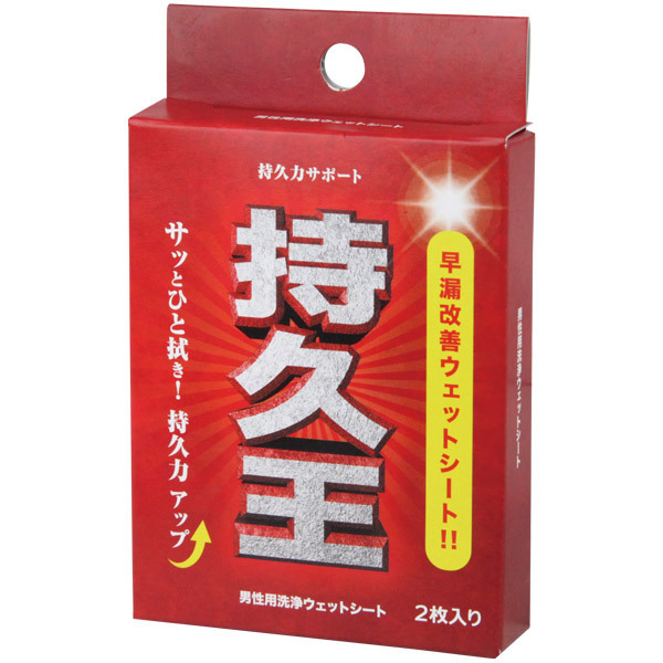 早漏改善ウェットシート「持久王 2枚入りウェットシート」。オタネニンジン根エキス、チョウジエキス、センブリエキス、ローズマリーエキス配合。