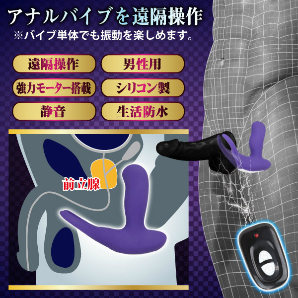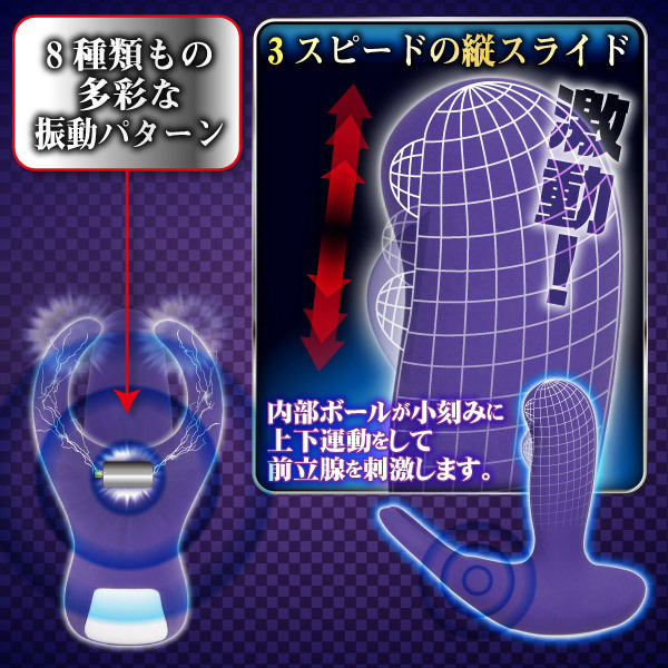 ●生活防水加工・パープルのソフトシリコンでコート●速度は3段階・前立腺に当たる内蔵ボールが小刻みにスライド●C字リングで後ろから玉袋の根元を完全ホールド●蟻の戸渡りへの振動は8種類・静音ハイパワーモーターを搭載。