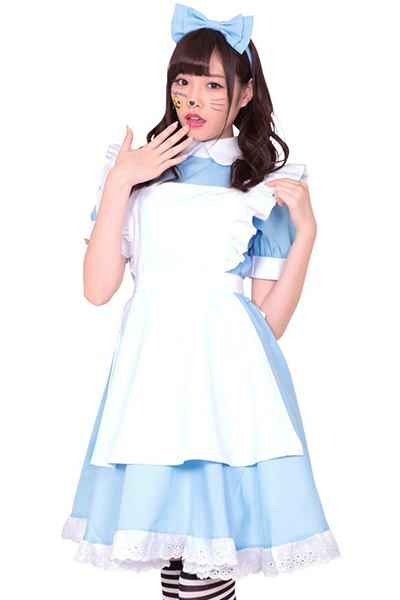 ●パステルブルー×ホワイトカラー●丸襟&パフ袖&裾レースワンピ●フリルいっぱいの白いエプロン●大きなリボンカチューシャ付き。