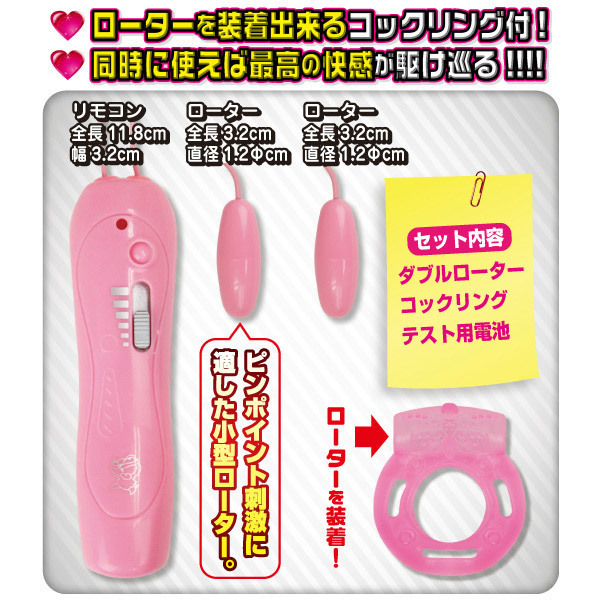 ●指先ほどの小さなダブルローター●ペニスを締め付けるコックリング●↑上部にローターをセット可能●リモコンでローター振動操作(スライドスイッチ)。