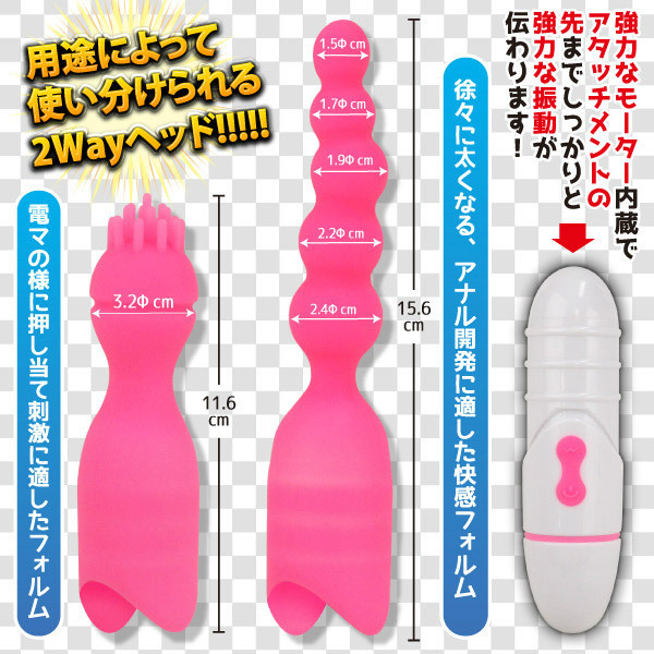 ●連なる5つの凸凹ボール×刺激的なブラシ突起●2つのシリコンヘッド(付属)●エイナスヘッドは全長(本体装着時):21.2cm/最大径:2.4cm●ブラシヘッドは全長(本体装着時):17.1cm/最大径:3.2cm●強力モーター内蔵●アタッチメントの先端までしっかり伝わる12種類の振動パターン●振動は弱→強へと変化●生活防水仕様●単四電池×2本使用(底部に電池BOX)。