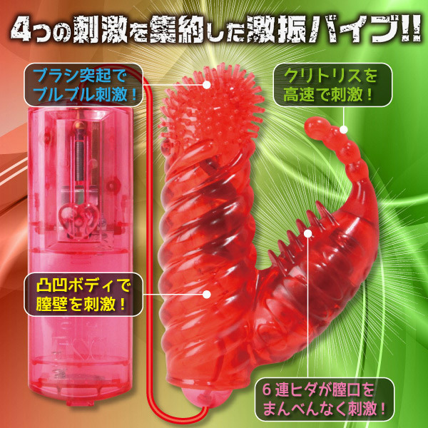 ●膣壁:凸凹トルネードの螺旋刺激●膣奥:本体先端ブラシのブルブル刺激●クリトリス:連結玉の高速刺激●膣口:クリバイブ側面ヒダの連続刺激●強弱調整はスライド式。