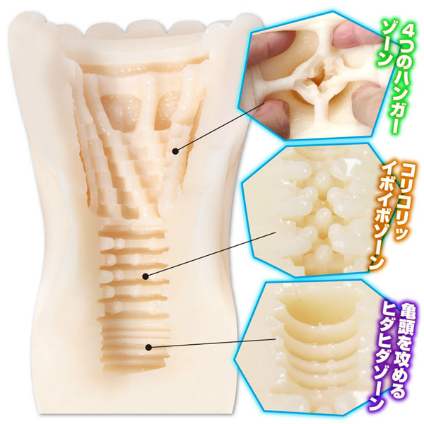 ●氷をイメージした幾何学模様入り●グリップしやすいくびれボディ●弾力感のあるややハードな質感●入口すぐに四方に広がるハンガー●穴がもう一つあるような挿入感●中盤:溝ヒダ×コリコリ粒々刺激●後半:先端を刺激する繊細横ヒダ。