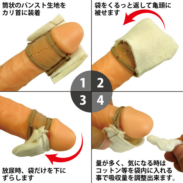 ●亀頭に直接被せる袋カバータイプ●袋部はお肌に優しいネル生地●装着部は筒状の伸縮ストッキング素材●排尿時は袋をずらすだけの簡単仕様●袋にコットン等を入れれば吸収量もUP●洗浄して繰り返し使用可。