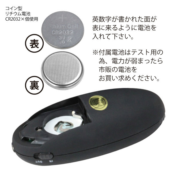 仕様:パッケージ:16.5×16.5×5.5cm 本体:クリップ部分開閉域〜2.0cm リモコン全長8.2cm 電池:ボタン電池(CR2032)×1個使用