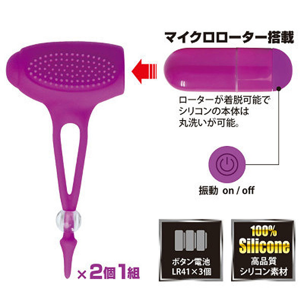 ●両乳首用本体2個セット●高品質シリコンを使用●側面に突起ブラシ付き●穴に乳首を通して装着●クリアビーズで調整可●乳首&乳房に振動刺激●シリコン部は丸洗いOK●ローターは着脱可能。