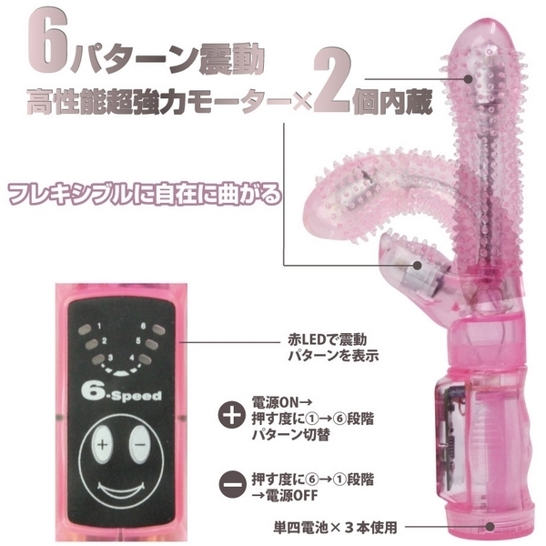 ●高い刺激を生み出す全面イボ突起ボディ●本体中央に角度を固定できる中芯入り●竿とクリバイブ両先端にモーター搭載●6種類のバイブレーションパターン●肌触りの良い高品質エラストマー製。