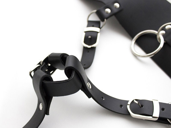 ●ハードなフェイクレザー素材●ウエスト調節できるベルト穴式●電マ用ベルト直径約3〜6φcm●アジャスターで長さ調整が可能●他拘束具と連結できるリング付き。