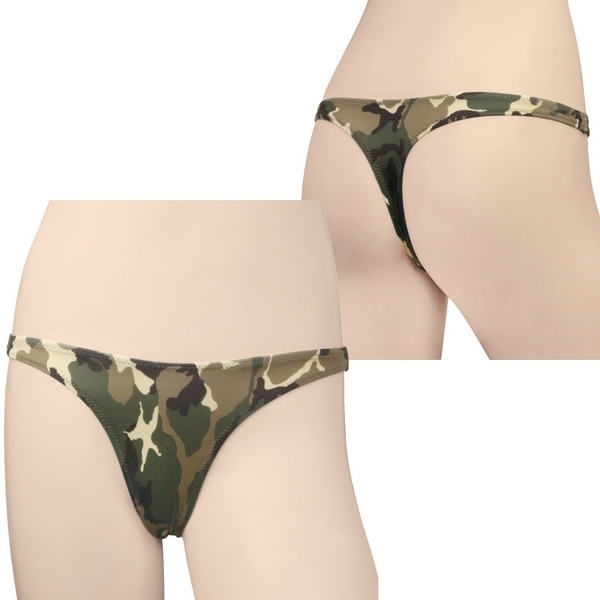 ミリタリー女子の魅せパンにも♪全面プリントの迷彩柄レディースTバックショーツ。●グリーン系のカモフラ柄ショーツ●ストレッチ生地で上下左右に伸縮●ボディにフィットして着心地抜群●セクシーなTバックタイプ●女性用Mサイズ・日本製。カジュアルなカモフラージュ柄を全面にプリントした、ワイルド&セクシーなランジェリーです。