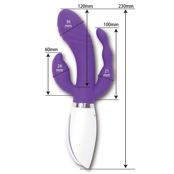 仕様:パッケージ:24.0×10.0×5.0cm 本体:全長23.0cm・クリバイブ6.0×2.4cm・ヴァギナバイブ12.0×3.6cm・アナルバイブ10.0×2.1cm 重量:220g USB充電式