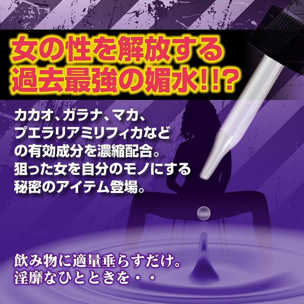 女の性を解放する「ナイトターゲット」!カカオ・ガラナ・プエラリアミリフィカ・マカ等の有効成分を配合。内容量は20ml。お飲み物に数滴垂らしてください。