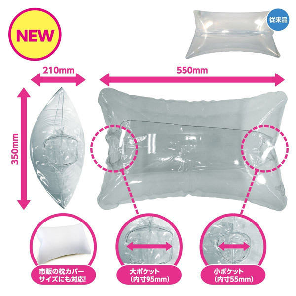 市販の一般的な枕カバー(55cm×35cm)が利用できるのでカモフラージュもばっちり!カバーをかければ普通の枕、しかしその一枚をはがすと…?あらゆるホールと激しいプレイを受け入れる魔性のピローに豹変します。