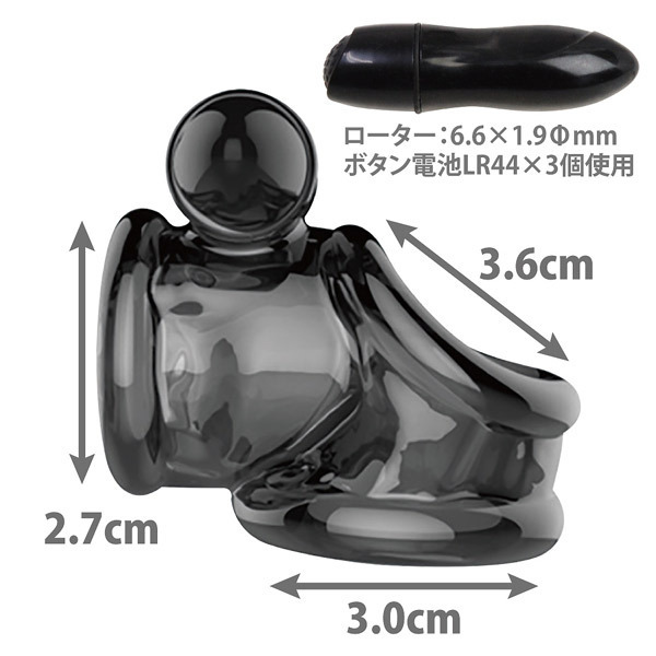 仕様:パッケージ:10.0×7.3×5.3cm 本体:リング内径(竿部分2.7cm・玉袋3.0cm・根本3.6cm)・ローター6.6×1.9cm 重量:56g 電池:ボタン電池(LR44)×3個使用