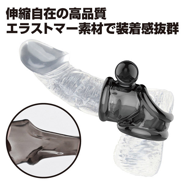 竿の根元と玉袋を締め付けながらクリトリスを刺激する攻撃力高めの男性用補助グッズ。