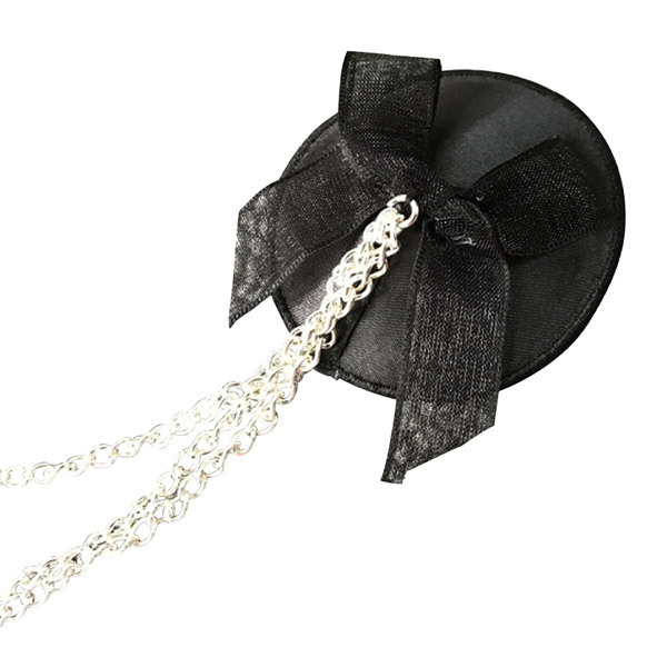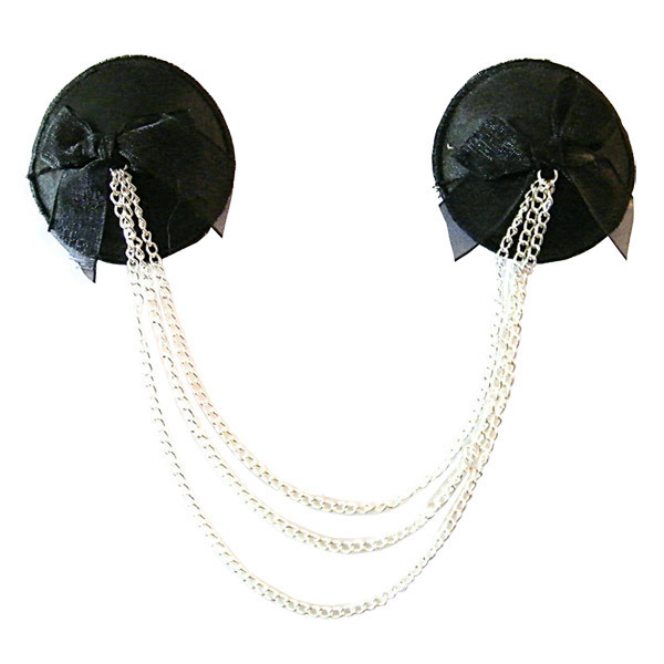 ピタッと貼るだけの簡単仕様♪バストトップ(乳首)に貼るだけで、手軽にオシャレが楽しめる下着感覚のニップルジュエリー「ニップルカバー チェーンデコレーション 黒」。複数回使用できる強力粘着シールタイプのボディアクセ。バストを美しく飾るリボン&3連チェーン付きのエレガントなデザインは、ショータイムやナイトパーティーにも最適です。
