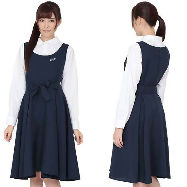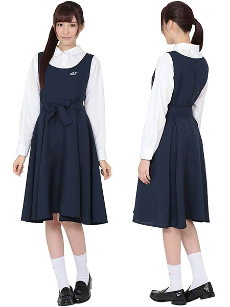ちょっぴりレトロっぽさを感じさせる制服コス!ネイビーカラーのジャンパースカートとホワイトカラーの長袖ブラウスが清楚感漂うスクールコスチューム。