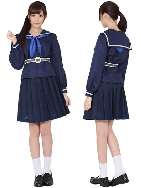 ネイビーカラーの制服は襟や袖口にラインがあしらわれ、膝上丈のプリーツスカートが可愛らしいコスプレ衣装です。
