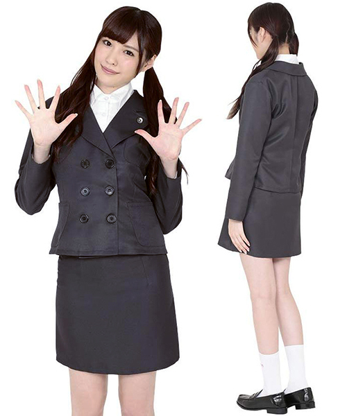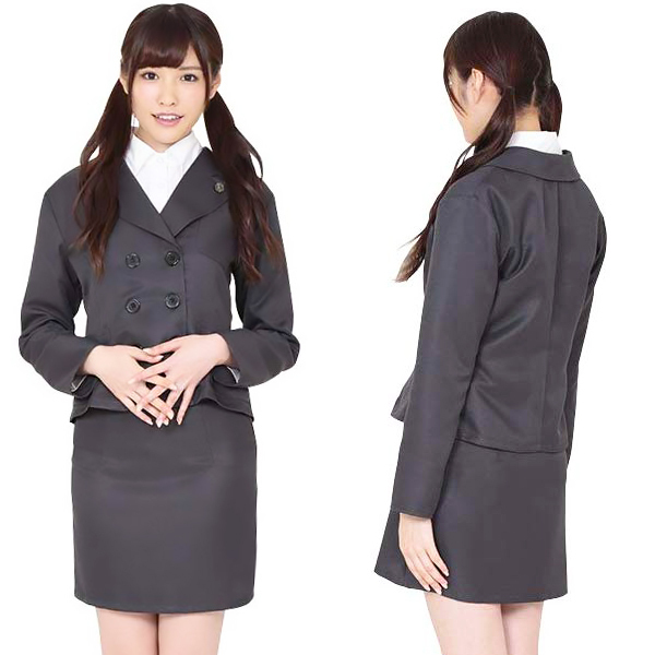 落ち着きのあるグレーカラーで統一されたダブルジャケットとタイトスカートが大人っぽい制服コスチューム。