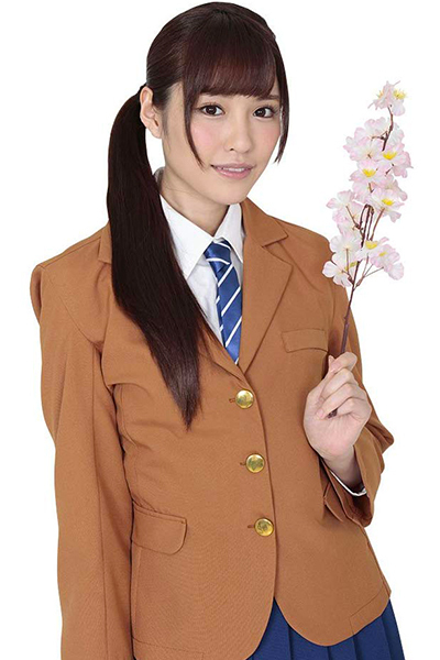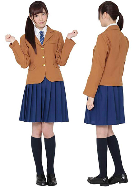 フロント部分の金ボタンは温かみのあるモカ色で、ブルーのストライプ柄のネクタイと相まって可愛らしさとかっこよさを見事に演出!スカート部分は明るめのネイビーカラーに膝上のプリーツスカートなので、学校制服の王道っぽさも兼ね添えています。