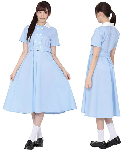 清楚なパステルブルーのカラーに白襟が、上品な印象と少女らしさを兼ね備えた可愛らしさを演出してくれます!ワンピースタイプでふんわりと広がるガーリーなスカートは、自然なスリットも入っていて学生気分に浸りたいときにもオススメ。