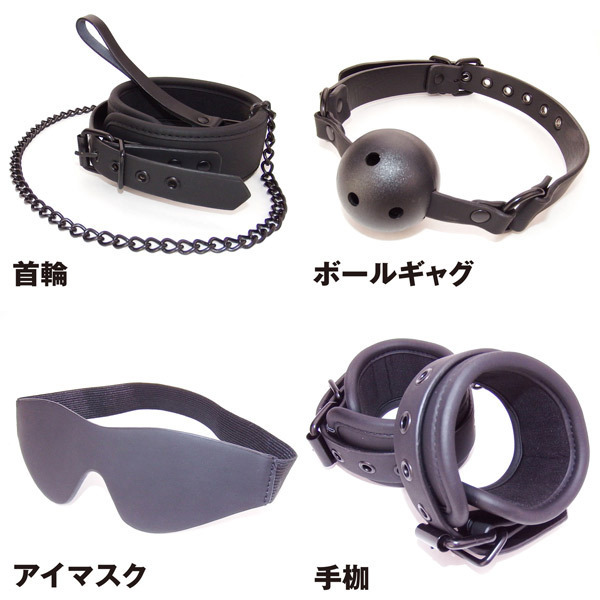 仕様:パッケージ:26.0×35.9×6.0cm セット内容:首輪、ボールギャグ、アイマスク、足枷、パドル、ムチ、手枷