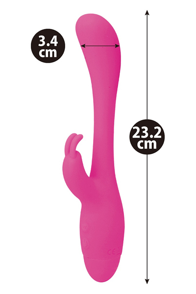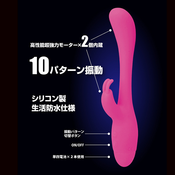 先端部分とクリバイブに内蔵されている強力モーターが生み出すバイブレーションは圧巻!滑らかな肌触りのシリコン製ボディは挿入しやすく、先端はぷっくりと膨らんでいてGスポットを狙いやすく、クリバイブはうさぎの耳の形となっているためしっかりとクリを捉えてくれます♪挿入すると穴道に合わせて追随するフィット感バツグンの先端構造は思わず垂涎モノ!10パターンもの豊富な振動に動同期する挿入部とクリバイブは、どちらも生活防水仕様なので使用後のメンテンス性にも大変優れています。