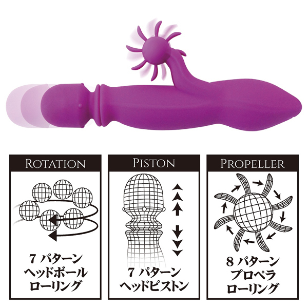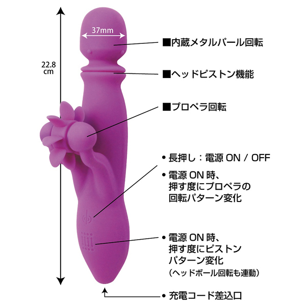 ピストン&プロペラ回転とヘッド部分に内蔵されているムービングボールにより、女性器を徹底的に責め立てるウインドミルバイブ!大回転するプロペラがクリをガッツリ愛撫しながら、強力ピストンヘッドがボルチオもしっかりと開発。