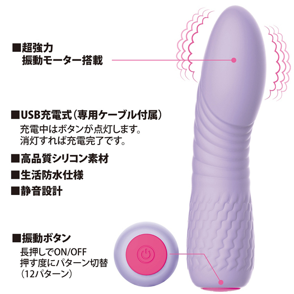 全長11.8cmのコンパクトなボディに高性能と高品質を詰め込みました♪12種の強力振動でピンポイント刺激が楽しめる淡いパープルカラーの一本式シリコンバイブレーター。
