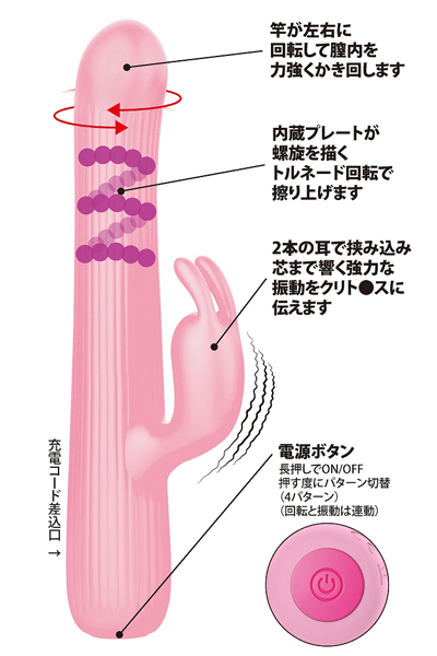 螺旋回転がGスポットを擦り上げるように刺激!更にウサギ型の子機が強力振動でクリをピンポイントで刺激します!●4パターンのトルネード回転●4パターンの子機振動●高品質シリコン素材●生活防水●静音設計●専用USB充電コード付属、充電時間:90分、連続稼働時間:50分