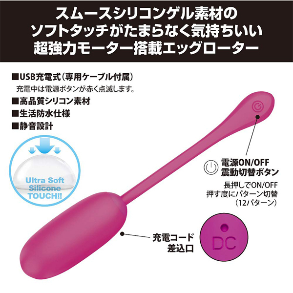 側はサラッとしたシリコン、内側は柔らかなスムースシリコンゲル素材を使用した、ソフトタッチがたまらなく気持ちいい超強力モーター搭載エッグローター!柔らかな優しい挿入感、しかし震動は超強力でGスポットへと快感が響き渡ります。