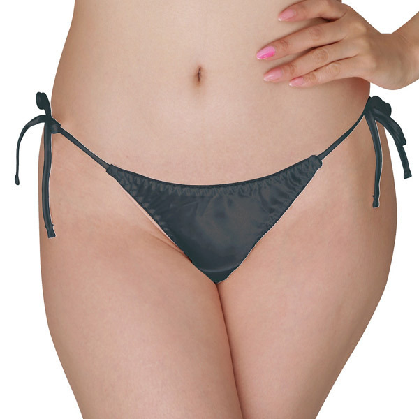 光沢感が美しいサテン生地の女性用Tバックショーツ。両サイドはセクシーな結びヒモ仕様で、結び目をパートナーに解かせる楽しみも!ブラックカラー