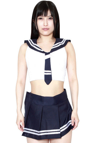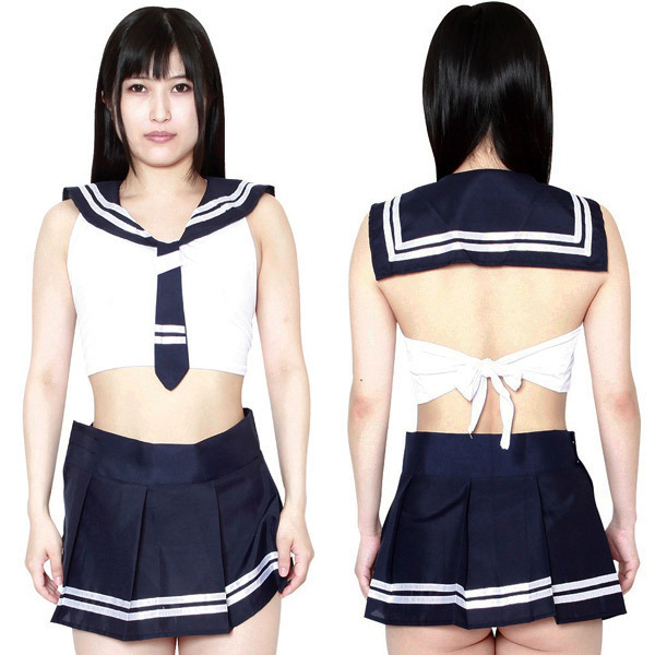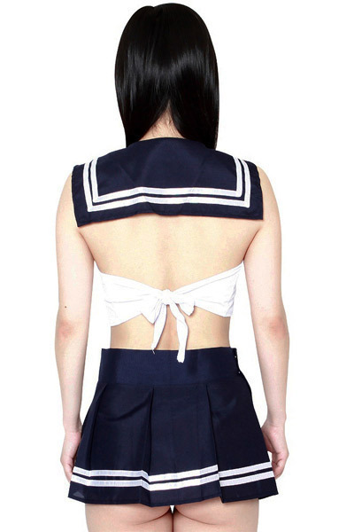 ネイビー×白の定番セーラー服を色気たっぷりに仕上げた、後ろ結びミニ丈トップスとマイクロ丈プリーツスカートの2点セット!セーラー服特有の大きな襟と、ボックスプリーツスカート、そして紺色のネクタイには太目の白ラインを2本施しています。