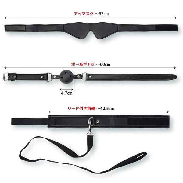 商品ID:b27969 カラー:-- 種類:SM・拘束具 仕様:フリーサイズ パッケージ:31.0×19.0×7.5cm セット内容:アイマスク、ボールギャグ、リード付き首輪、手枷、バラムチ