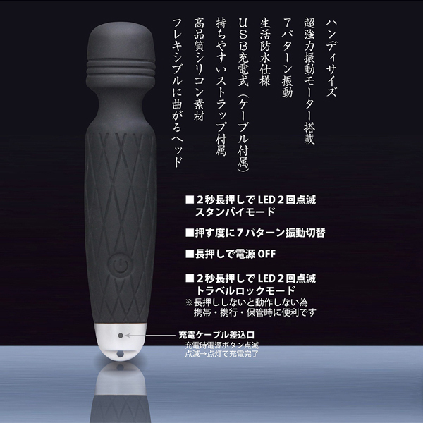 肌に優しい高品質シリコン素材を採用!柔軟に曲がるフレキシブルヘッドで欲しい部分をピンポイントに刺激する♪幅3cmほどの先端部には強力振動モーターを搭載、振動パターンは7種類からお選びいただけます。