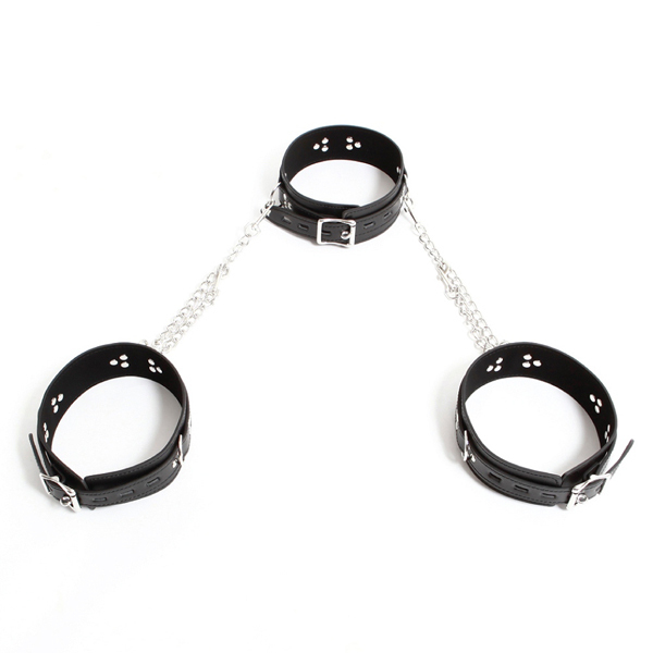 仕様:パッケージ:48.0×20.0×2.5cm 本体:首輪(55.5×5cm・ベルト穴5個)・太ももベルト(55.5×5cm・ベルト穴5個)・拘束チェーン41.0cm セット内容:首輪×1本、太ももベルト×2本、拘束チェーン×2本 素材:合皮、金具