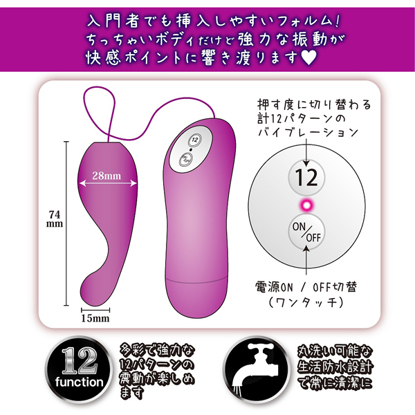 ポコッと飛び出た先端が絶妙な角度でGスポを狙い撃ち!コンパクトボディから繰り出される12パターンもの強力振動が最高の絶頂へと誘います。