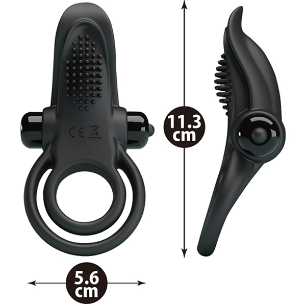 根元からギュッと締め付け男性をサポートしつつ、10パターンの強力振動でパートナーを刺激するシリコン製の電池式ペニスリング(単4電池×1本使用)。