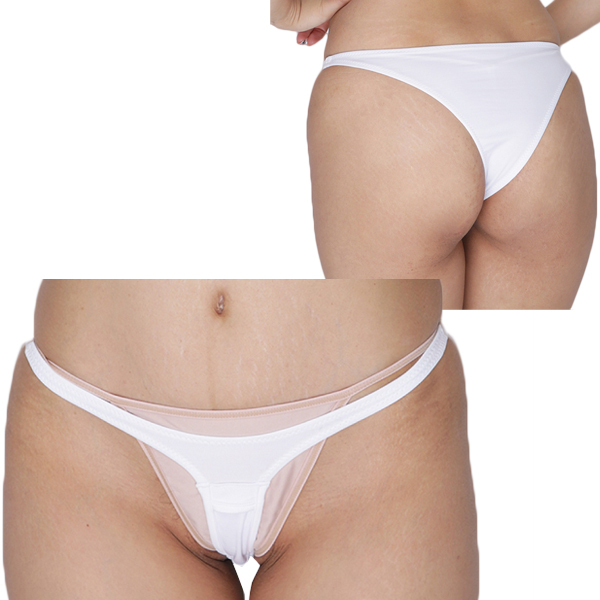 伸縮性のあるストレッチ生地がT字に食い込む刺激的なレディース用ハーフバック(白)。カップルで楽しめる仕掛けにクロッチ部分にローター収納ポケットを、クロッチ部分にリングを取り付けた過激デザイン!視覚的にも刺激を味わえる日本製ハーフバックです。※ローターは付属しておりません。