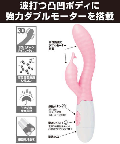波打つ凸凹ボディが膣壁を刺激!更に強力ダブルモーターを搭載!波打つ美しいシリコンボディが芯まで響く快感振動とともに極上の快楽へと導く…●30パターンバイブレーション●高品質シリコン素材●生活防水