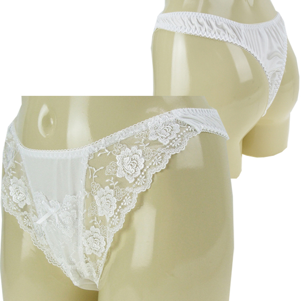 艶やかな光沢が美しいフェリカ生地と繊細なレース生地を組み合わせた日本製Tバック(白)。